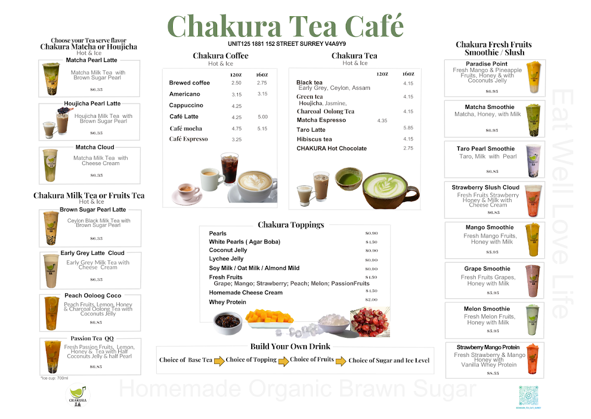Welcome to **Chakura Tea Cafe**, a charming haven located at 1881 152 St #125, Surrey, BC. This delightful cafeteria is the perfect spot for those seeking quality beverages and tempting treats. The menu features a wide selection, ensuring something for everyone.